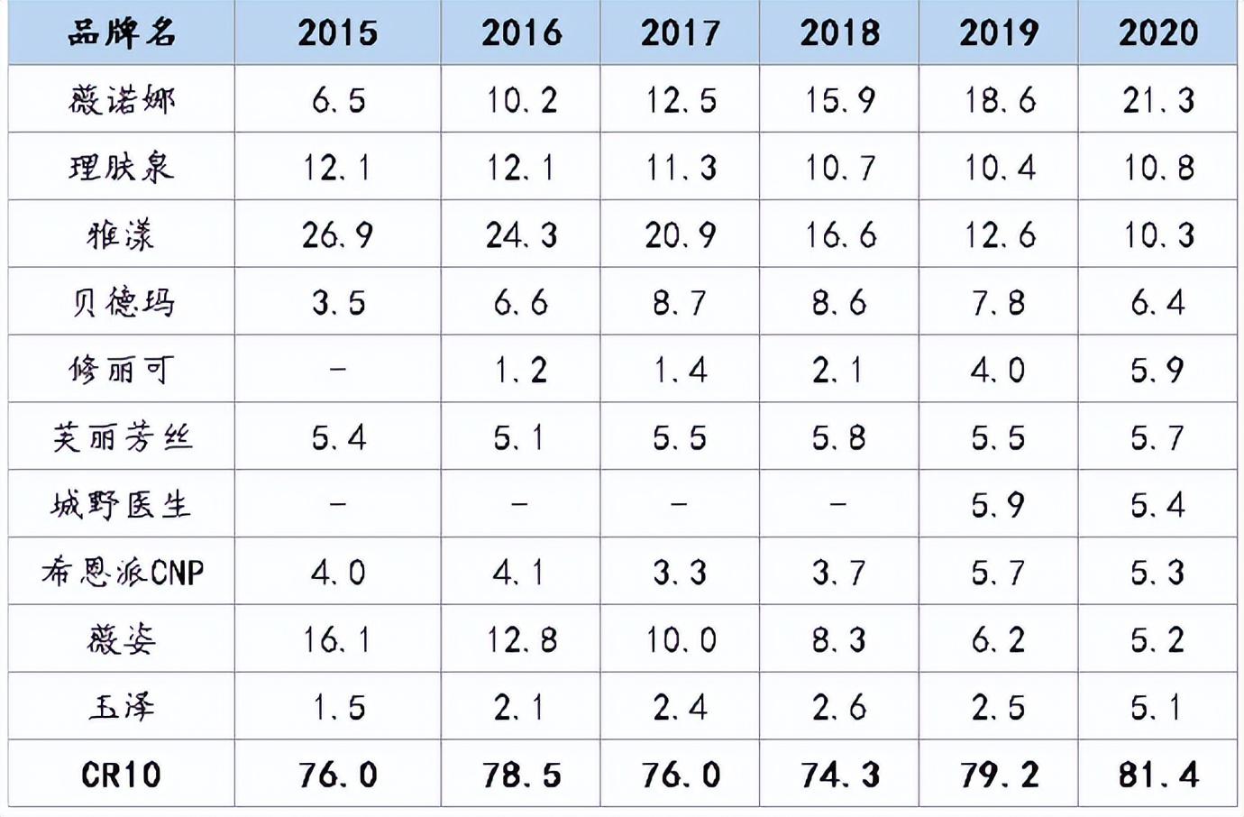 从竞争格局上看,我国皮肤学级护肤品行业集中度高,且本土品牌更具成长性。2020 年,我国皮肤学级市场 CR10 合计市占率 81.4%,高于皮肤学级市场 CR10 的 57.7%,严监管下行业集中度有望进一步提高。从国内前十品牌排名变化来看,薇诺娜作为敏感肌护肤国货龙头,市占率由 2015 年的 6.5%一路攀升至 2020 年的 21.3%,成功实现弯道超车,2019 和 2020 年在国内皮肤学级护肤品市场市占率连续排名第 1;另一国货品牌玉泽也以 5.1%的市占率跻身2020 年国内皮肤学级护肤品市场前十;国外品牌总体市场份额呈下滑态势。皮肤学级护肤品强调功性和性,消费者品牌忠诚度高,且本土品牌更加了解国人肤质和消费习惯,相对海外品牌更具市场竞争力及品牌成长性。