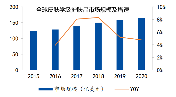 国内皮肤学级护肤品市场兼具高增速和低渗透,发展空间广阔。皮肤学级护肤品主要指采用温和科学的配方,强调产品性和专业性,适用于肌肤敏感等问题的肌肤护理产品。随着生活水平的提高及消费理念趋于成熟,消费者对于产品成分的关注度不断提升,皮肤学级护肤品的市场需求也不断增长。根据Euromonitor 统计数据,2020 年皮肤学级护肤品市场规模 165.21 亿美元,2015-2020 年 CAGR 为 6.0%;我国皮肤学级护肤品市场规模由 2015 年的61.44 亿元增至 2020 年的 191.51 亿元,CAGR 达 25.5%,高出增速19.5pct,且远高于护肤品整体市场的发展增速。在亚洲地区,主要市场的皮肤学级护肤品渗透率仍大幅低于欧美等成熟市场。2020 年美国/法国皮肤学级护肤品市场渗透率(即皮肤学级护肤品占护肤品市场比例)分别为17.4%/45%,中国/日本/韩国分别为 7.1%/5.1%/6.6%,我国皮肤学级护肤市场渗透率仍有数倍的提升空间。