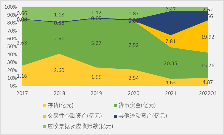 截止2021年Q1,公司总资产56.84亿元,股东权益49.23亿元,负债总额7.61亿元,资产负债率13.39%;负债方面,流动负债6.25亿元,占比82.13%,非流动负债1.35亿元,占比17.74%;资产方面,流动资产50.21亿元,占比88.34%,非流动资产6.63亿元,占比11.66%。