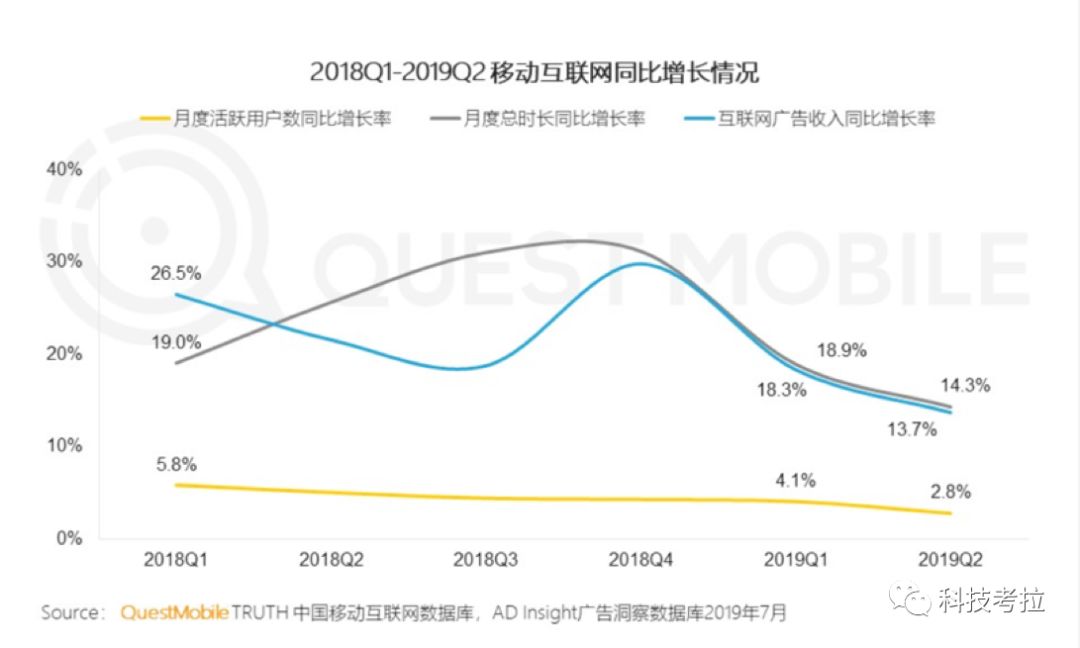 根据QuestMobile发布的《中国移动互联网2019半年大报告》显示,第二季度移动互联网月活跃用户下降近200万。