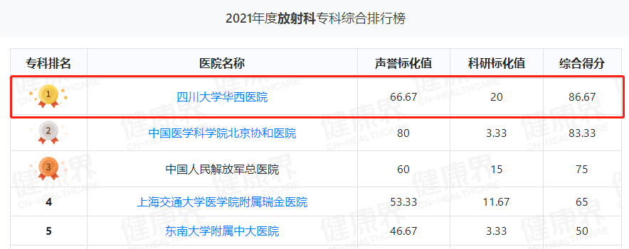 在专科综合排行中,四川大学华西医院29个专科进入全国前十名,其中麻醉科、放射科等2个专科位居全国第1;康复医学、急诊医学、呼吸科、泌尿外科等4个专科位列全国第2;重症医学、神经外科、普通外科、检验医学、超声医学、病理科、老年医学等7个专科位列全国第3。四川大学华西第二医院2个专科进入全国前十名,妇产科位列全国第6,小儿内科位列全国第9。四川大学华西口腔医院口腔科位列全国前列。