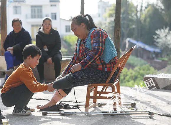 找到锯断腿的吴祖香时,夕阳照进大昌镇一个农家小院里。她和儿媳正在看孙子、孙女写作业。“我一个字都认不到,但就喜欢看我孙儿写。”她爽朗的笑声回荡在院子里。