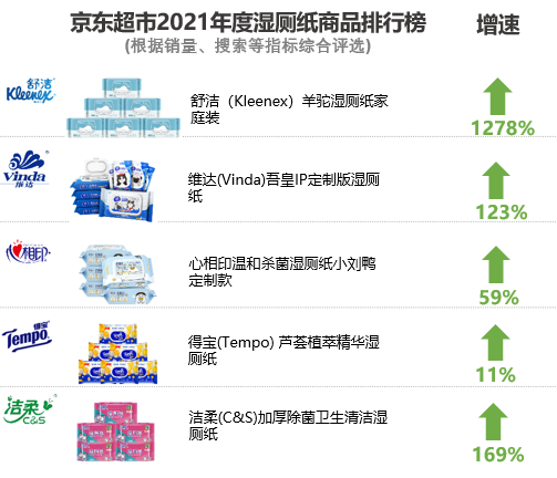 京东超市2021年度湿厕纸商品排行榜中,舒洁羊驼湿厕纸、维达吾皇IP定制版湿厕纸、心相印小刘鸭定制款湿厕纸位列前三,中高端产品占据前四个席位,充分体现了消费者在用纸方面的要求日益严格。