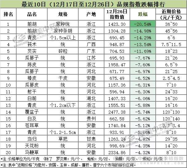 品规指数涨跌排行近10日,共有监测723个中药材品规,涨跌范围在-20.54%~31.04%之间,其中价格指数上涨的有100个,持平的有452个,另有171个品规下跌。