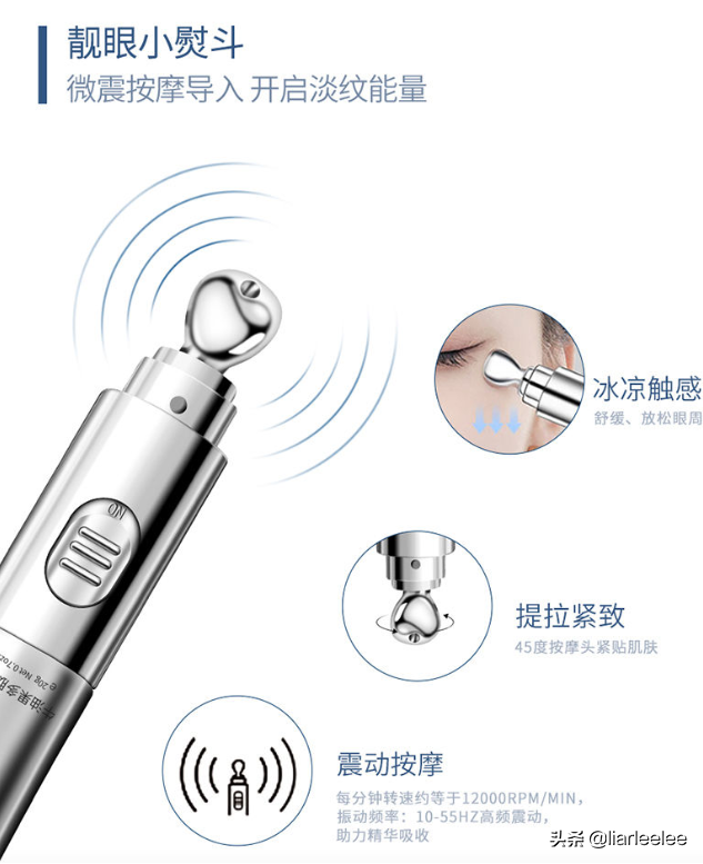 金属按摩头的吸热果和高频率的震动,还能降低眼周肌肤温度,促进血液循环,淡化黑色素,缓解眼疲劳~
