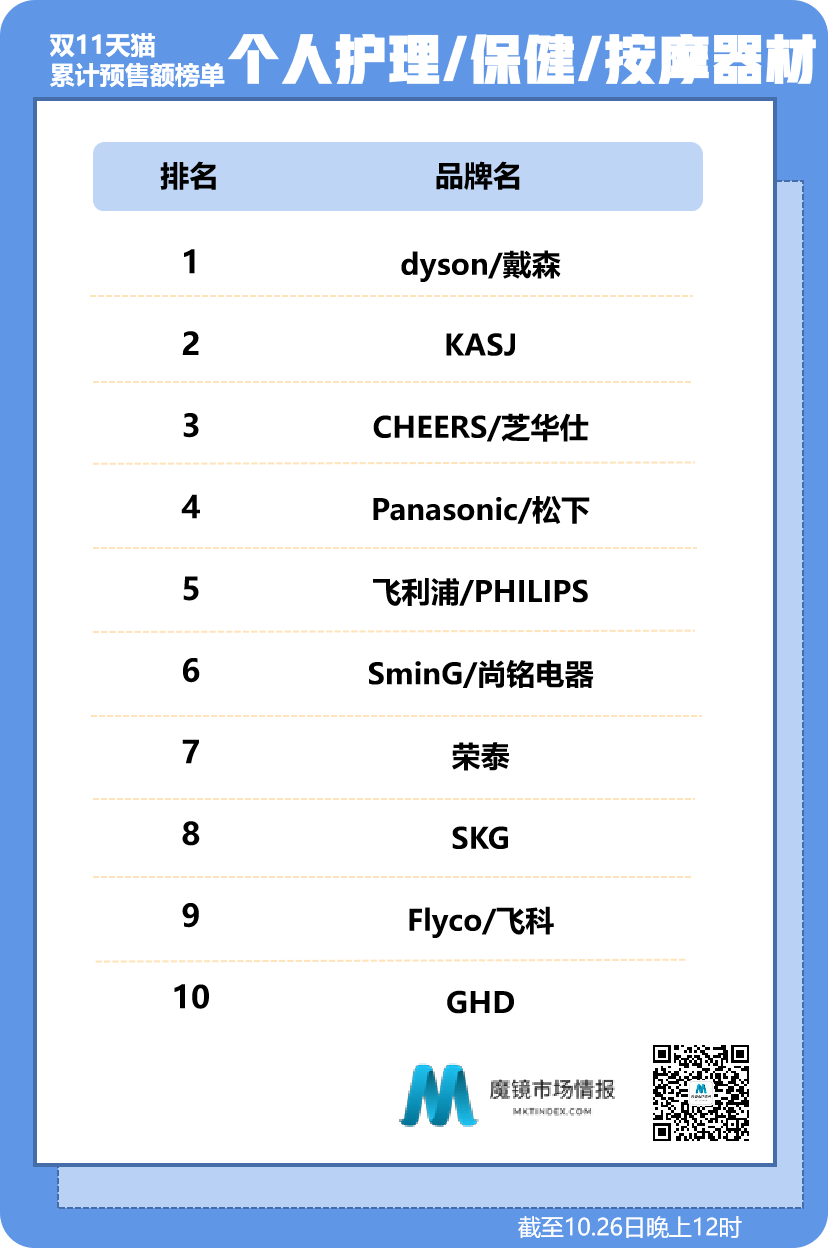 (快消品讯)昨日,魔镜市场依据淘宝天猫平台自10月20日晚8时—10月26日24时,共7日的累计预售额(统计金额按商品金额计算,非仅定金)品牌排行。