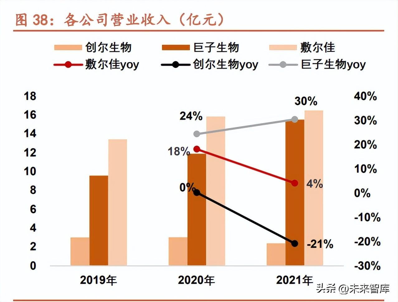 规模体量上看,敷尔佳和巨子生物体量较大,创尔生物营收业绩规模较小。2021 年,敷尔佳、巨子生物和创尔生物 分别实现营收 16.50/15.52/2.40 亿元,同比+4.08%/+30.41%/-20.80%。创尔生物业绩下滑较多,主要系受营销策略 调整及营销部门迁移人员变动影响导致。
