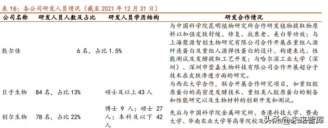 (4)对比:巨子和创尔研发实力较强,敷尔佳通过合作补短板