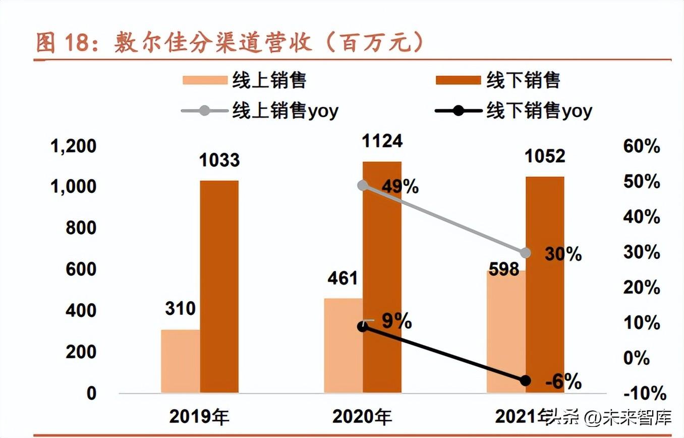 “医美面膜”的鼻祖:大单品策略成显著。敷尔佳的产品布局较早,是市场上先提出“医美面膜”概念的品牌, 同时公司不断通过营销强化消费者教育,通过大单品的打造提升营销率。医用透明质酸钠修复贴(白膜和黑膜)上 市时间较早,在多年的市场销售中树立了良好的品牌形象,为公司积累了良好的市场口碑,敷尔佳的“白膜”和“黑 膜”在竞品中具有性价比和品牌的双重优势,也成为医美面膜的龙头产品。目前,公司上市销售逾 40 个产品,已拥 有多个年销售额过亿元的单品。 把握私域流量运营,增强用户粘性。敷尔佳的产品推广早是在微商渠道快速传播,因此对于私域流量的把 控是敷尔佳品牌发展壮大的关键。公司于 2015 年建立微信公众号,现有粉丝近 97 万人;于 2017 年建立微博品牌号, 现有粉丝 46 万人;2021 年 8 月至今,公司企业微信月均新增粉丝 1.5 万人,整体留存率 80%以上,现有活跃粉丝 11 万人,复购率达到 20%,月均成交总额 30 万元以上。借助私域流量随时可随时触达、自由控制、反复使用且免费的优 势,公司可以与客户即时互动,进一步了解用户特点和诉求,增强用户粘性。 搭乘国风潮流,提升品牌格调。公司以“专业修复、贴心呵护”为品牌文化,通过赞助“时间的朋友”跨年演讲、“知 识进化论”4.23 世界读书日主题演讲,将产品与文化融合,实现从产品营销到品牌理念的推广。公司充分发挥创新媒 介的广泛传播力,牢牢抓住国货品牌意识和 Z 世代国货消费理念,选择符合品牌定位的明星艺人代言,赞助同期收视 率领先的影视综艺节目,利用新媒体营销渠道开展直播、KOL 合作,从而形成电商平台、综艺赞助、种草推广、直播 推广、电梯新媒体推广五大推广渠道,宣传果显著。敷尔佳直播间新客户数量持续增长,转化率也不断攀升。