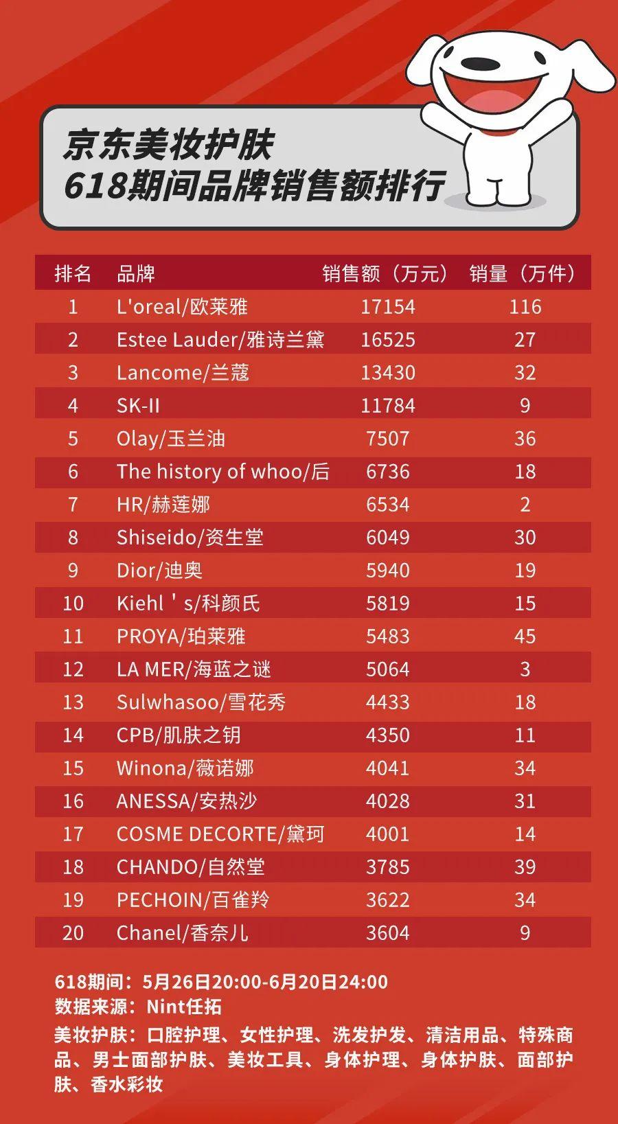 具体到品牌排名方面,根据数字零售数据服务商Nint任拓统计的京东美妆销售额数据(自5月26日20时至6月20日24时),从京东美妆总榜来看,欧莱雅、雅诗兰黛、兰蔻瓜分前三席,成为受“剁手党”喜爱的国际品牌。