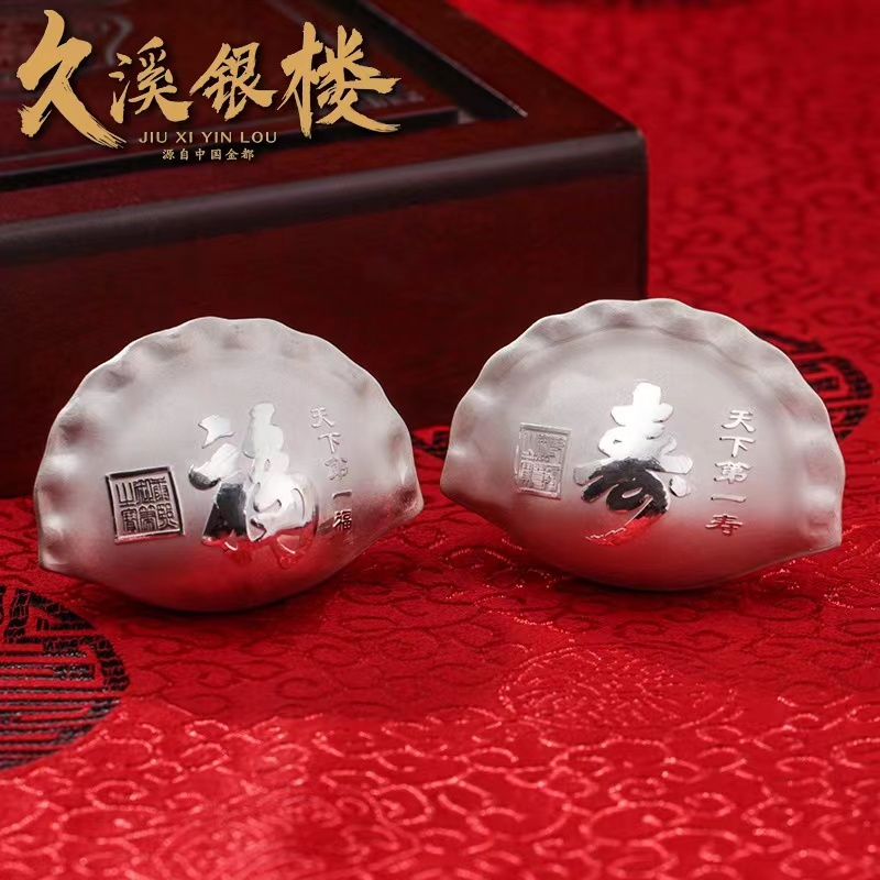 圆圆的饺子做工精致可爱,每个饺子都是选用999足银,一个有30克。饺子上有带着美好祝福的“福”、“寿”二字,既可以做摆件,又很适合做收藏。