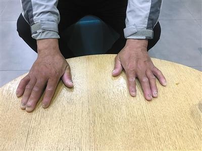 刘忠林展示指甲的旧伤。记者 袁静伟 摄