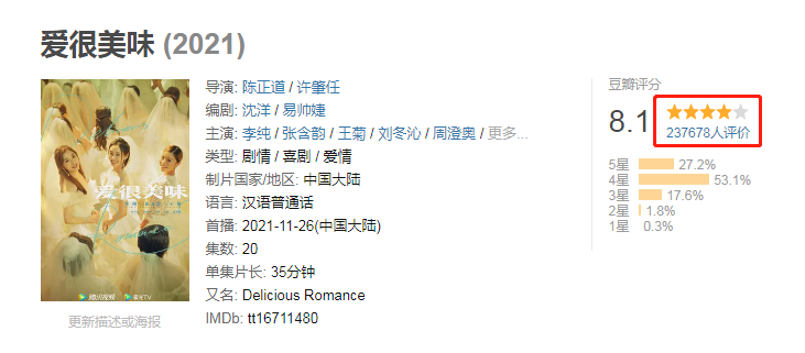 尽管是现在再看,《爱很美味》在豆瓣上的评分还是惊人的高。