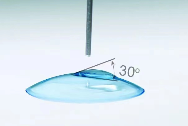 普诺瞳®角膜塑形镜全系列产品均采用特殊的低温大气等离子处理。相比真空等离子,其处理温度低且能量集中,尤其是大气中的水分子也参与等离子过程,可使镜片表面的亲水基团羟基(-OH)水平显著提高,增加镜片表面的亲水性,从而降低表面湿润角(如上图),使配戴的舒适感加倍提升。同时形成亲水抗蛋白保护层,有减少佩戴过程中泪液脂蛋白的沉积。