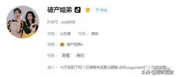 破产姐弟:以美妆店铺作为场景依托,将剧情和美妆结合,讲述一对姐弟在店铺中遇到形形色色的人以及与这些人在此接触发生的各种故事。目前粉丝数有1100万。
