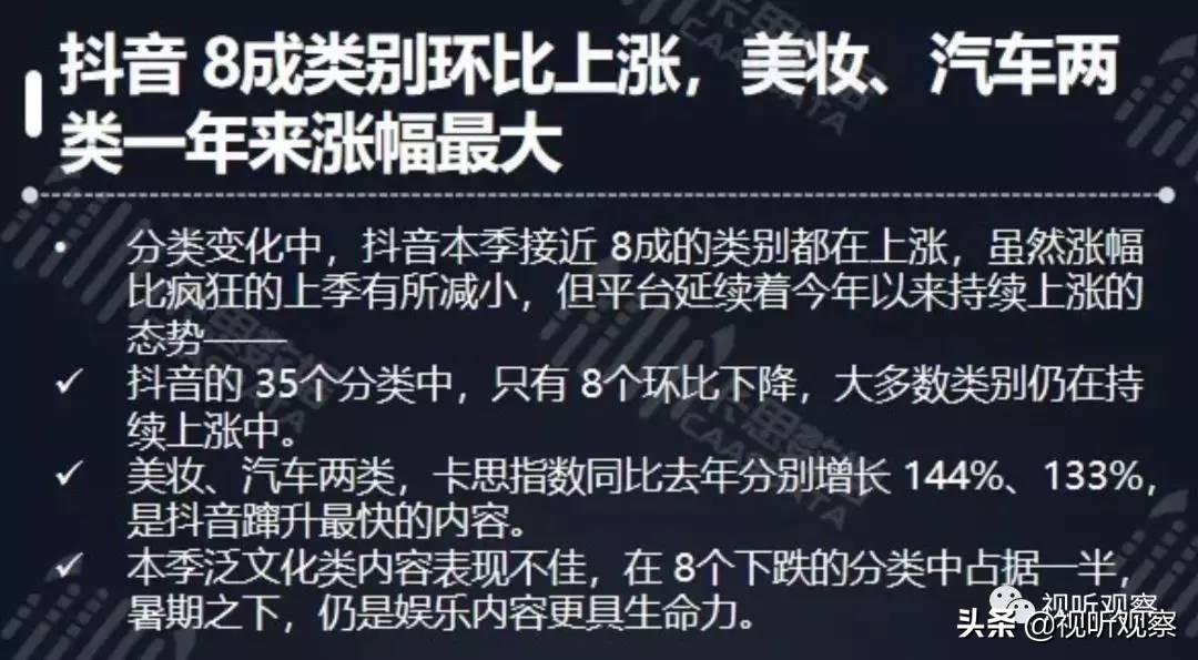 根据卡思新2019Q3KOL数据报告,抖音的美妆类卡思指数同比去年增长144%,是抖音蹿升快的内容,未来有极强的可发展性。