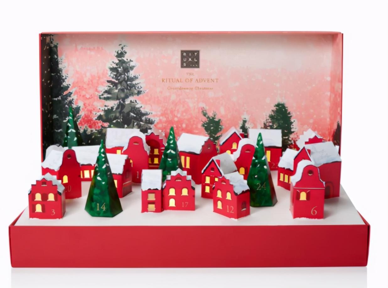 一个覆盖着白雪屋顶和松树的村庄。你将收到24份节日礼物,总价值145英镑,从香棒到香薰蜡烛,再到护肤品,是一个很棒的圣诞装饰品!