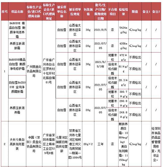 涉及的标示生产企业、不合格产品为:广州澳鑫化妆品有限公司生产的BARUXUE 精品白如雪 嫩颜净纯滋养霜、BARUXUE精品白如雪 嫩颜净纯修护霜、白如雪 BAIRUXUE 金纯净颜醒肤霜、养颜玉肤调肤霜、养颜玉肤滋养霜;中国(深圳)柔盈化妆品有限公司生产的大长今美白亮肤祛斑套装,广州柔美伊美容化妆品有限公司生产的馥兰诗晶透沁白淡斑霜;广州市纤雅化妆品有限公司(委托单位:纤雅国际(韩国)株式会社)生产的娇伶美白祛斑霜;广州双拾意化妆品有限公司生产的雪飞婷双拾意·双重美白祛斑霜;辽宁省丹东市华特化妆品有限公司生产的宝莲堂祛斑祛皱膏;广州市金栢丽保健品有限公司生产的柏诗春天牛奶瞬透精华仙液(瞬间美白型);浙江欧诗漫特种化妆品有限公司生产的欧诗漫珍珠白精萃美白原液。