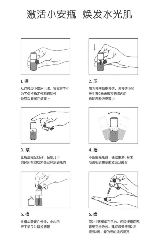 VC水光瓶,富含6%高天然维生素C,为了让VC保持活性,trilogy还贴心的设计了按钮瓶盖,将VC粉与瓶内的透明质酸浓缩液隔离开来避免氧化。激活的步骤流程注意往下拉哦~VC精华涂抹在脸上就能感受到那种的水润感,坚持用肌肤的整体状态是透着水光感的白,孕妈妈也可以放心使用~