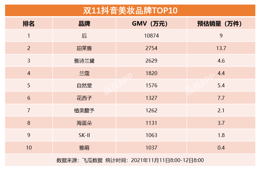 从抖音全平台来看,双11期间美妆品牌TOP10排行榜上,国货和外资几乎各占五席。从GMV表现上,的后,在双11当天卖出了10874万元,排名第二珀莱雅则卖出了2754万元,两者差距。