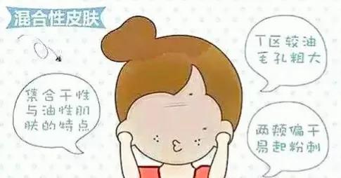 特征:脸上油性和干性两种皮肤混合存在,油性皮肤呈T形分部,即额头部、鼻部周区泛油,长粉刺,而眼睛和脸颊部位较干。