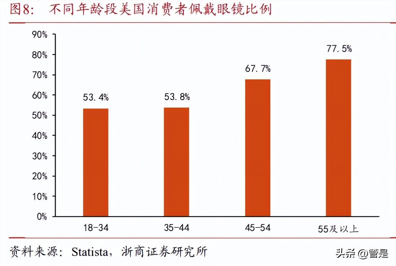 我国近视人口持续增长,青少年近视率整体偏高且有低龄化发展趋势。据 Statista 数据, 2012-2020 年我国近视人数从 4.5 亿增加至 7.1 亿人,CAGR 为 5.9%。其中我国青少年近视 率偏高且呈现低龄化发展趋势。据卫健委,2020 年我国儿童及青少年近视率 52.7%,其中6 岁以下儿童近视率为 14.3%,高中生近视率高达 80.5%,大学生近视率超过 90%。 眼镜市场稳定成长,中国市场增速较高。根据 Euromonitor 数据,(1): 2007-2019 年眼镜产品市场规模由 1084 亿美元增至 1380 亿美元,CAGR 为 2.03%;且伴随 眼镜产品人均支出的提升,预计 2026 年规模有望增长至 1697 亿美元(CAGR 21-26 为5.71%);(2)中国:2007-2019 年眼镜产品市场规模由 225 亿元增至 894.5 亿元,CAGR 为 12.18%;预计 2026 年国内市场将突破 1204 亿元(CAGR21-26 为 5.99%)。