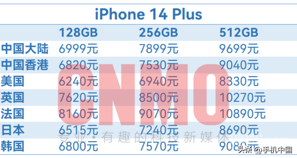 iPhone 14有128GB、256GB以及512GB三种版本可选,售价为1019欧元、1149欧元、1409欧元。