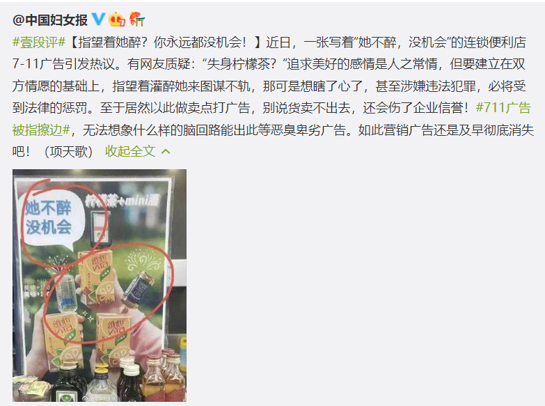 有网友发现,7-11便利店酒货架上的广告海报上赤裸裸地写着:“她不醉,没机会。”