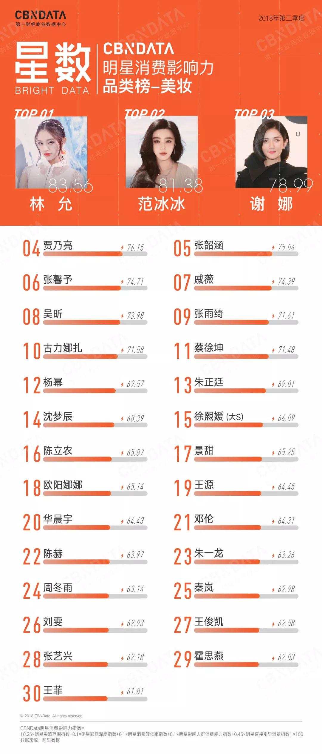 连续三个季度“CBNData明星消费影响力--美妆品类榜”上,亮眼的带货明星非林允莫属,从一季度的季军,一路上升到二季度的亚军,终到第三季度的。如此稳定发挥的美妆带货力堪称碾压娱乐圈。而且凭借在美妆品类的超强带货力,林允也位列2018三季度“CBNData明星消费影响力总榜”第12名,自入围二季度总榜时取得排名22的成绩后,又有显著提升。