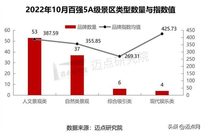5A级景区百强榜单中,人文景观、自然景观依旧稳居冠亚军,分别上榜53和37个5A级景区;细分类型中,以历史遗址型景区、山岳型景区、小镇型景区为主,分别占据32、15、11个席位。从品牌指数来看,10月5A级景区各类型中品牌指数由高到低分别为:现代娱乐类(425.73 )、人文景观类(387.59 )、自然类景观(355.85 )、综合吸引类(269.31 )。细分类型品牌指数由高到低分别为:文化演艺型景区(547.29 )、文化场馆型景区(437.06 )、历史遗址型景区(417.02 )。