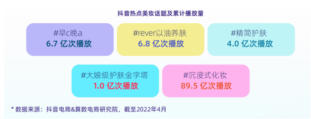 在抖音平台上,国内外品牌和美妆达人参与展开各种新奇创作,#美妆话题播放量达1003.9亿次,吸引消费者了解并种草相关内容,孕育并推动美妆行业新趋势的流行。以抖音热点美妆#话题为例,#大娘级护肤金字塔#话题在达人骆王宇的推动下,截至2022年4月,播放量超1.0亿次。国内外品牌和美妆达人的深度参与,让抖音成为美妆行业趋势“造风者”。