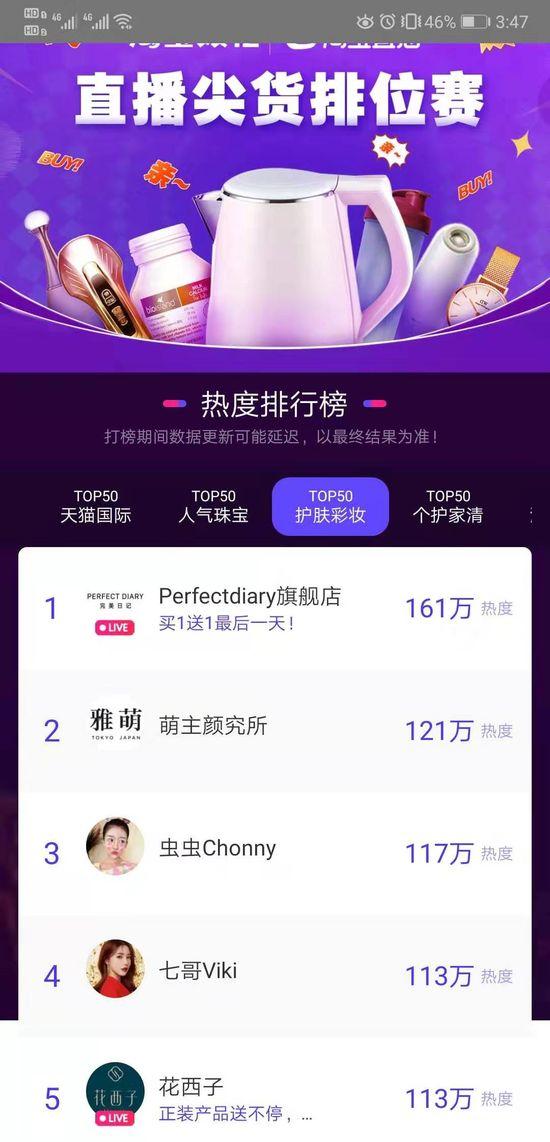 【亿邦动力讯】12月12日消息,日前,淘宝直播举办双12直播尖货排位赛。截至12月12日15时46分,护肤彩妆榜TOP5依次是Perfectdiary旗舰店、萌主颜究所、虫虫Chonny、七哥Viki、花西子。