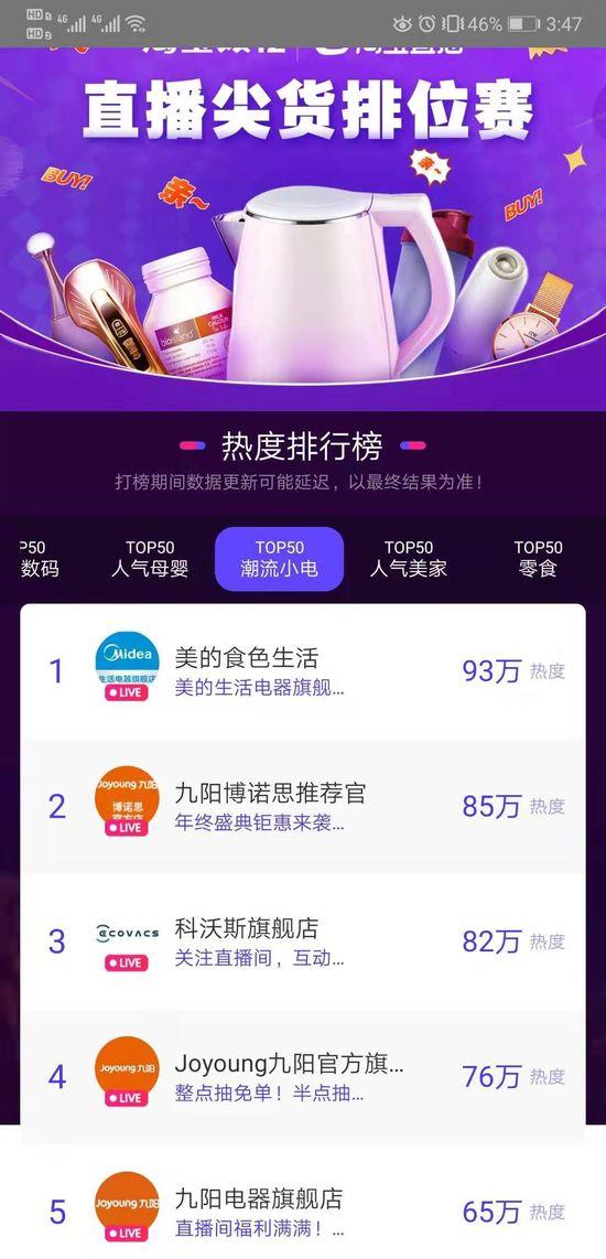 榜单显示,美的食色生活、九阳博诺思推荐官、科沃斯旗舰店、Joyoung九阳官方旗舰店、九阳电器旗舰店位居潮流小电排行榜TOP5。