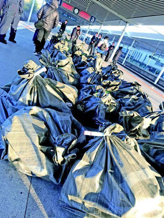 11月11日早上7点20分,在泰安高铁站4站台上,发往北京南的G338次“复兴号”高铁列车准时抵达。与平日不同的是,2号车厢门口前,整齐码放着73个高铁专用快递包裹袋,其中就有买家们凌晨下的单,共计400多件快递。两个多小时后,这些货物将抵达北京。预计今年“双11”期间,泰安有15吨货物将通过高铁发往全国。
