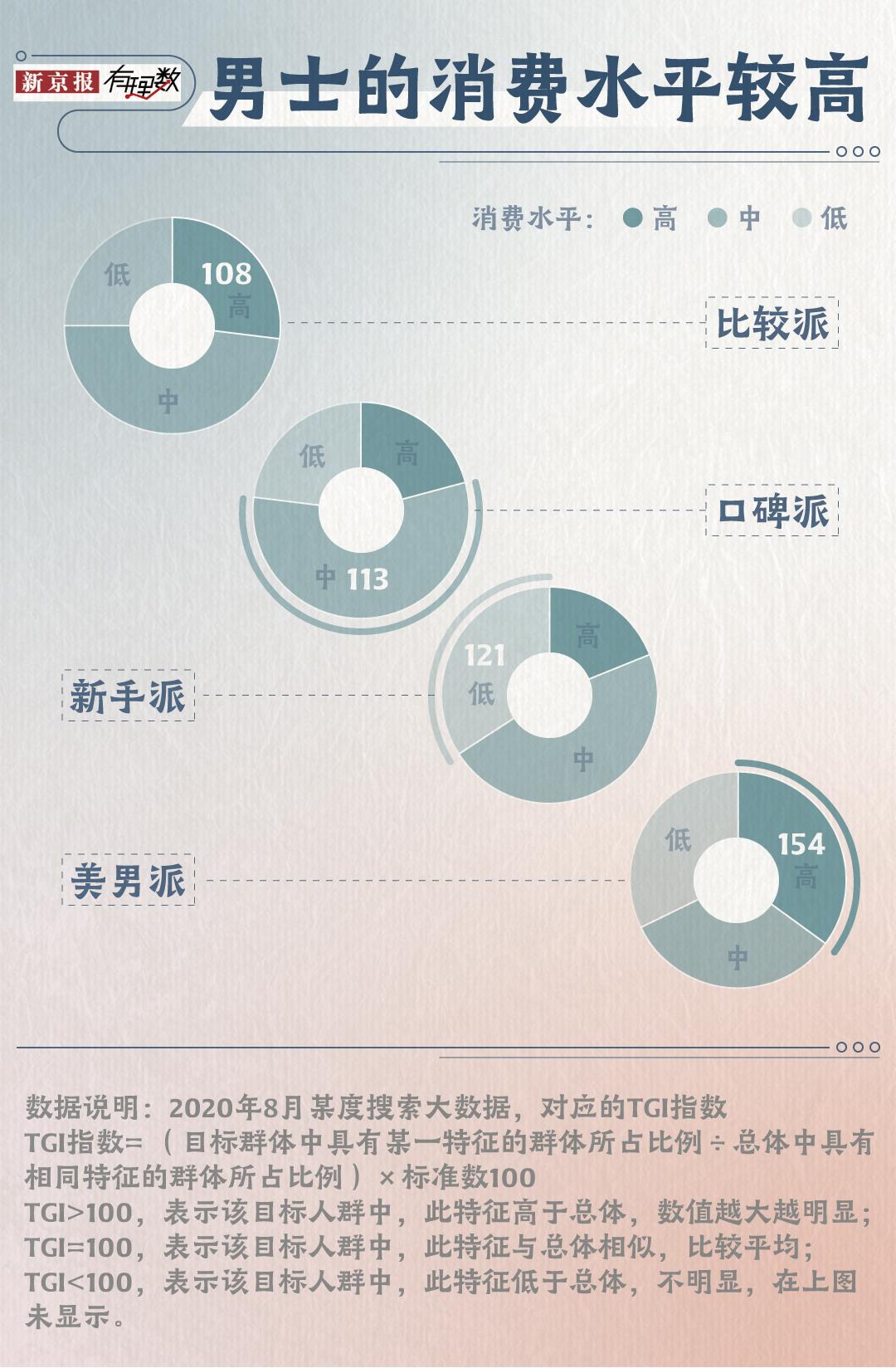 通过数据处理,我们可以看到,低消费水平的新手派居多,中等消费水平的口碑派居多,高消费者则更多地集中在比较派和美男派,其中美男派全部是男性。如果拿比较派和口碑派、新手派做对比,则男性相对占比更多。所以综合比较,在美妆行业的高消费群体中,男性更多。