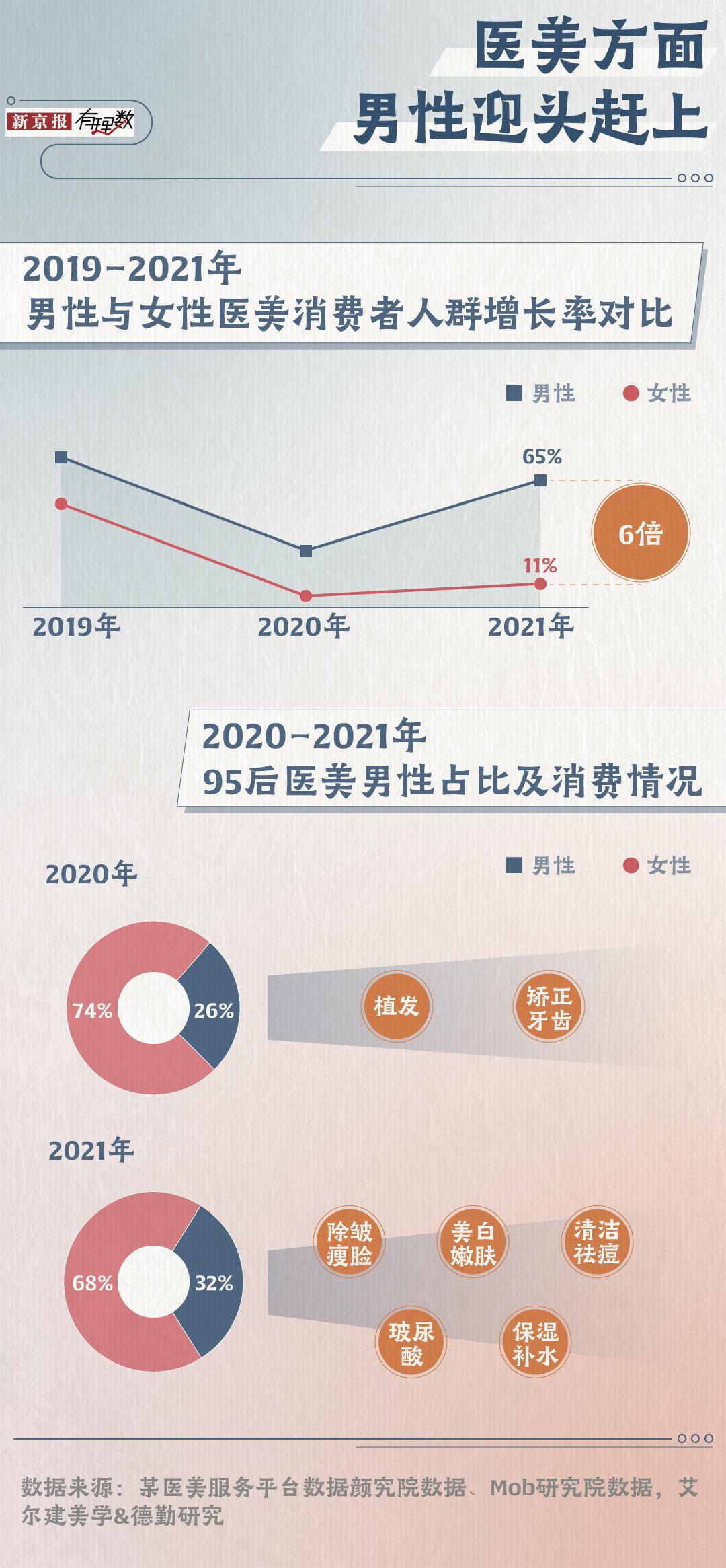 2019-2021年,男性医美消费者的增长率连续3年领先于女性医美消费者的增幅。在2021年男性医美消费者增长率更是达到了65%,是女性医美消费者增速的6倍。这其中也包含了很多95后。