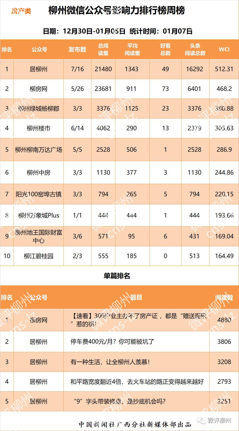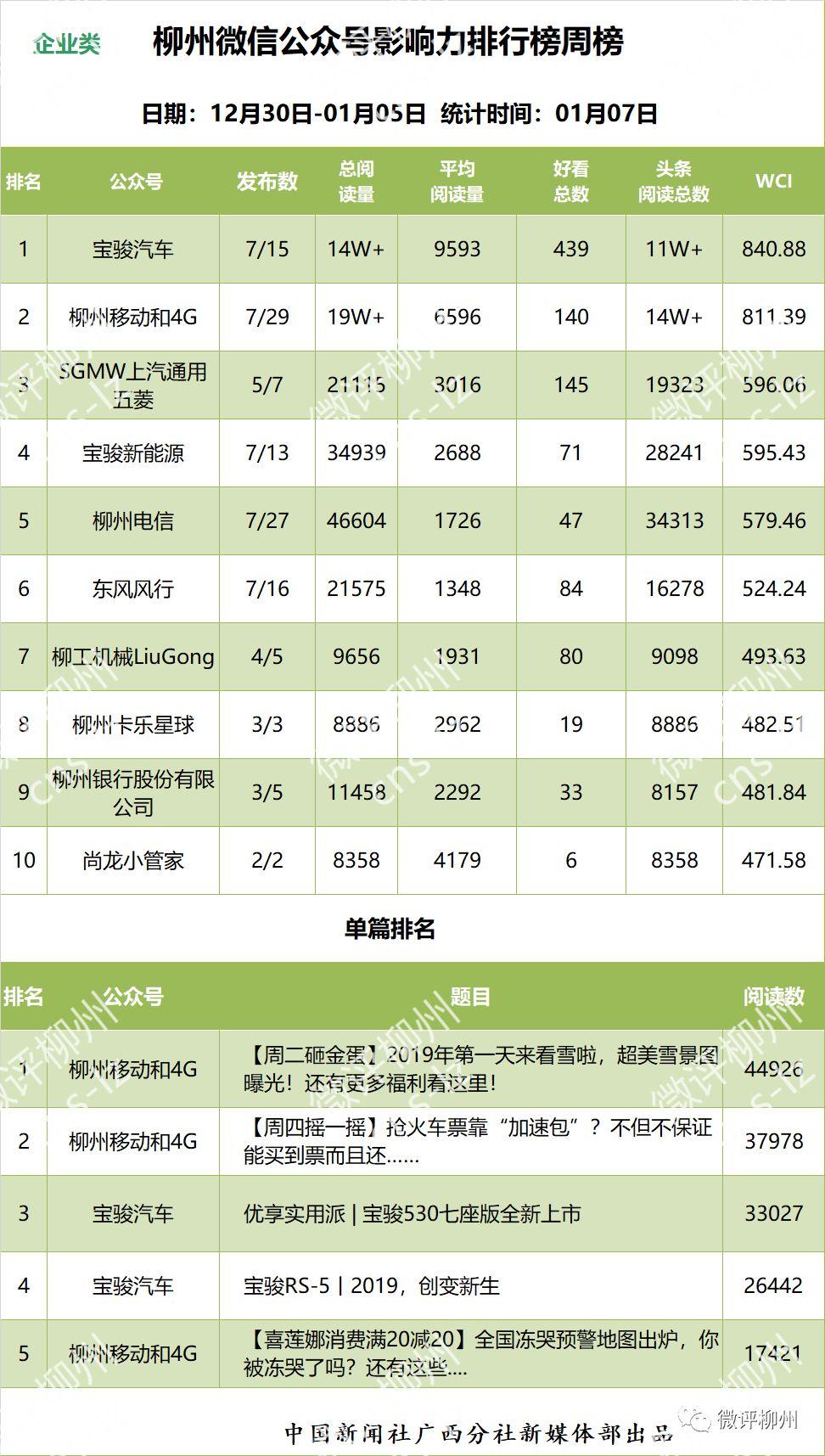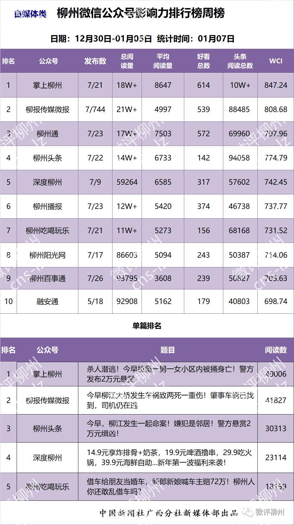 欢迎关注“柳州微信公众号影响力排行榜”。这是一个综合评估柳州本土微信公众平台传播力和影响力的榜单,由中国新闻社广西分社新媒体部出品,秉承独立、公正、专业的媒体素养,并特邀业界学界人士担任顾问,每周发布。