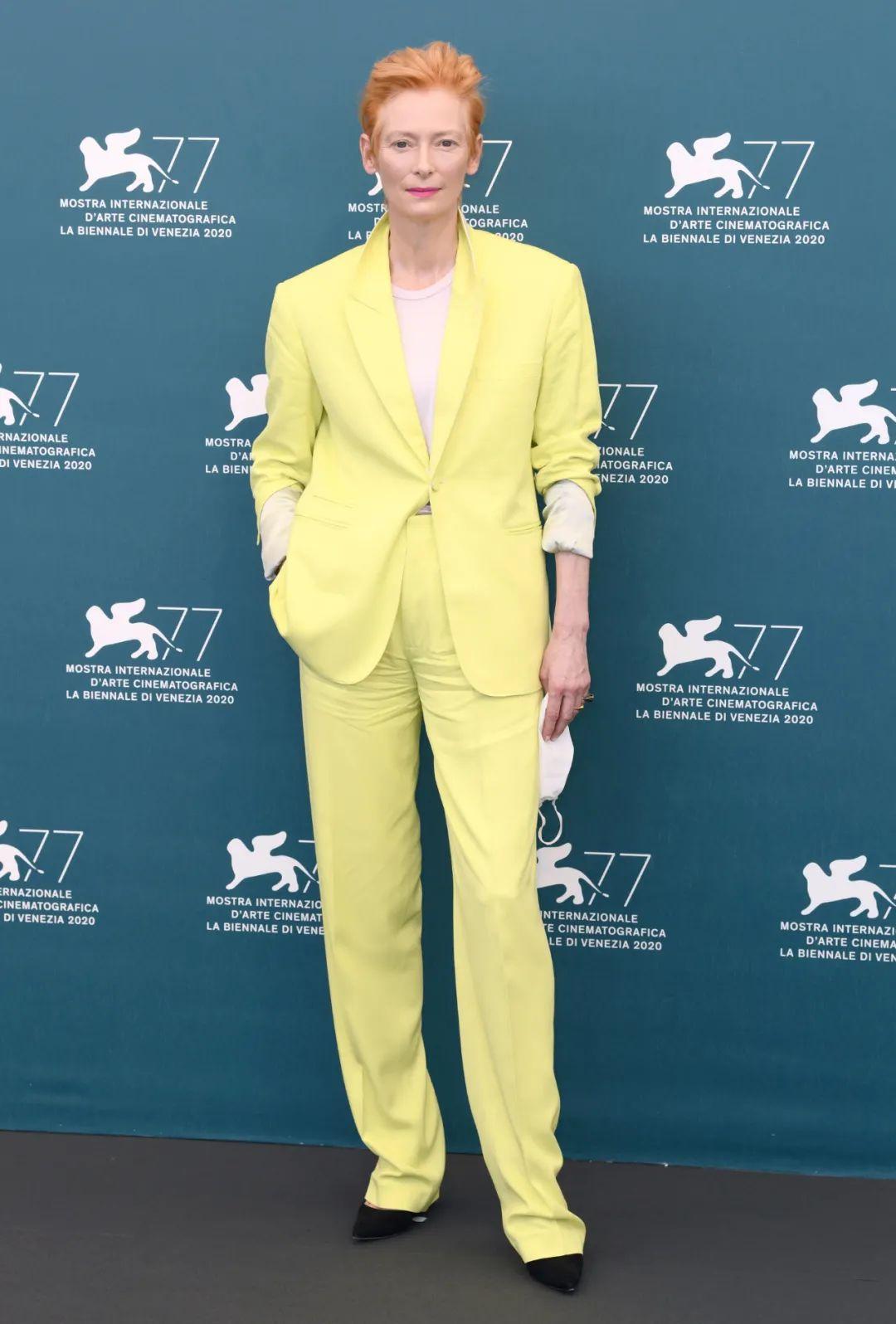 在电影节尾声的那两天,Tilda再次玩起了荧光黄色的西服,释放出清冷、不凡的气质。即使是Haider Ackermann这种简单廓形中又有精致细节勾勒的高级感,Tilda也能穿出属于她的味道。