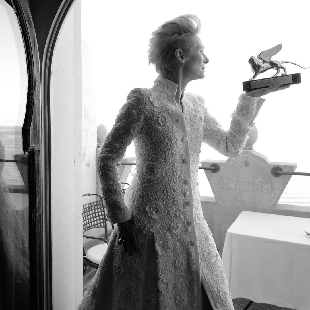 这捧着终身成就奖的欢喜小表情在Tilda的脸上依旧那么矜持又克制。