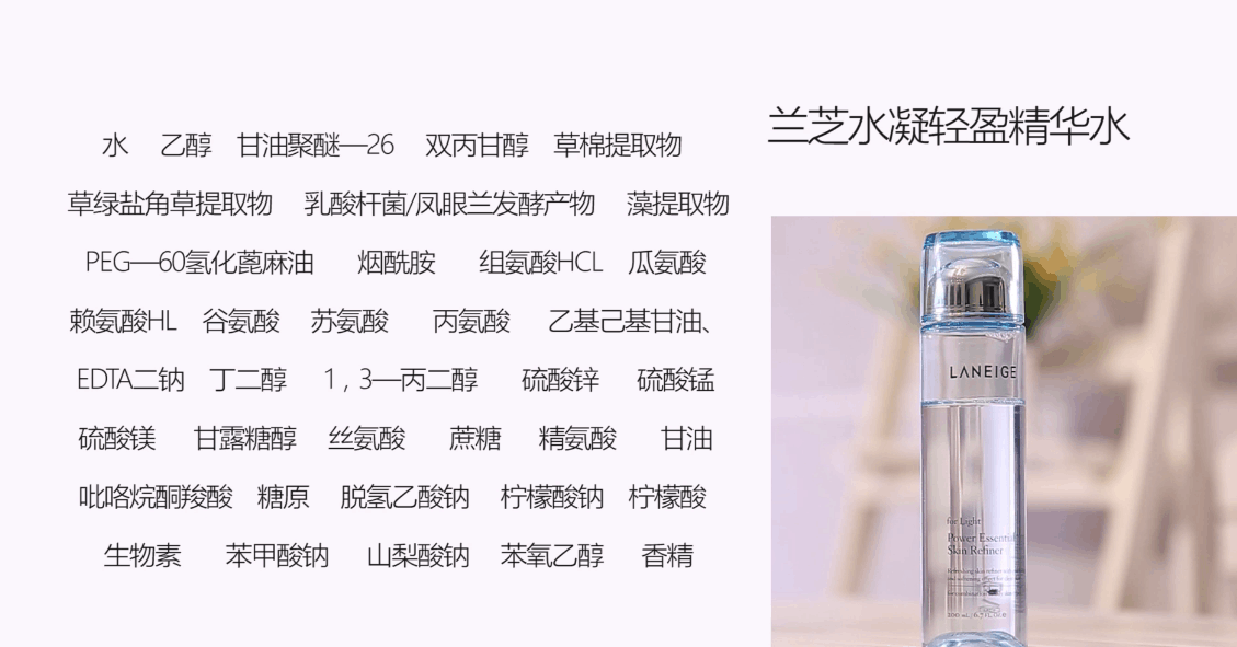 这款兰芝的水水凝轻盈精华水(吐槽一下,现在的化妆水名字真难念,可能商家得了一种不装逼就会死的病),没有内盖,它的酒精味道会稍微淡一些,然后有一些花香。