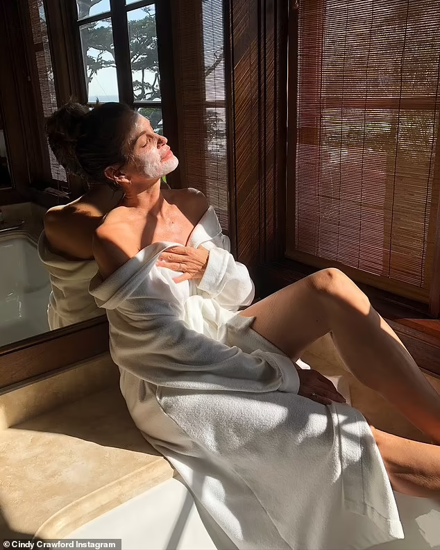 辛迪·克劳馥身穿白色浴袍倚靠在自家的浴缸边上,正享受着温和的日光浴,纯白的浴袍滑落肩膀,秀出她的锁骨和太平洋一字肩。她单手扶着胸口,昂着头晒太阳的样子尽显温柔,感觉空气中都飘着香氛的味道。她敷着涂抹式的面膜,但侧颜依旧可以看到超凡的骨像轮廓美,下颚处没有一点下垂的嘟嘟肉和双下巴痕迹。阳光下裸露的香肩皮肤光滑紧致。
