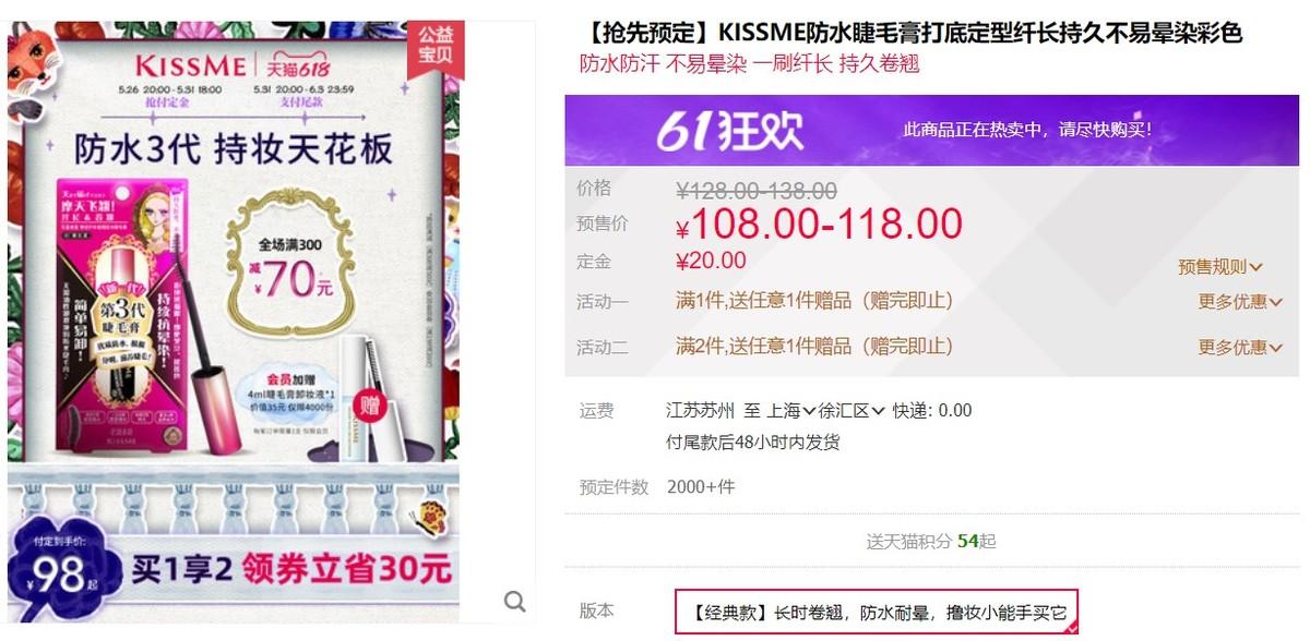 2022年618理想生活狂欢季于5月26日20点正式开启,丽人丽妆助力美妆品牌KISSME霸榜睫毛膏预售榜TOP1。日本国民彩妆品牌KISSME的多款爆品除在日本拥有口碑外,在中国同样好评如潮,KISSME防水睫毛膏在618预售首日即登顶天猫睫毛膏预售榜单第一,深受年轻消费者青睐,线上持续热销。