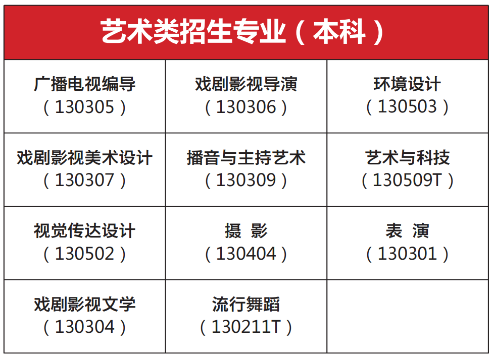 学校发挥综合性大学学科门类齐全的优势,将艺术教育与人文、科技有机融合,围绕广播电视、电影与网络媒体产业,开设广播电视编导、播音与主持艺术、戏剧影视文学、戏剧影视导演、戏剧影视美术设计、表演、摄影、视觉传达设计、环境设计、艺术与科技、流行舞蹈等11个艺术类本科专业。多年来,学校先进的教学理念、的教学环境和浓厚的学习氛围,为培养了大量的影视产品创意制作、网络媒体内容生产及环境艺术设计等领域的艺术人才。