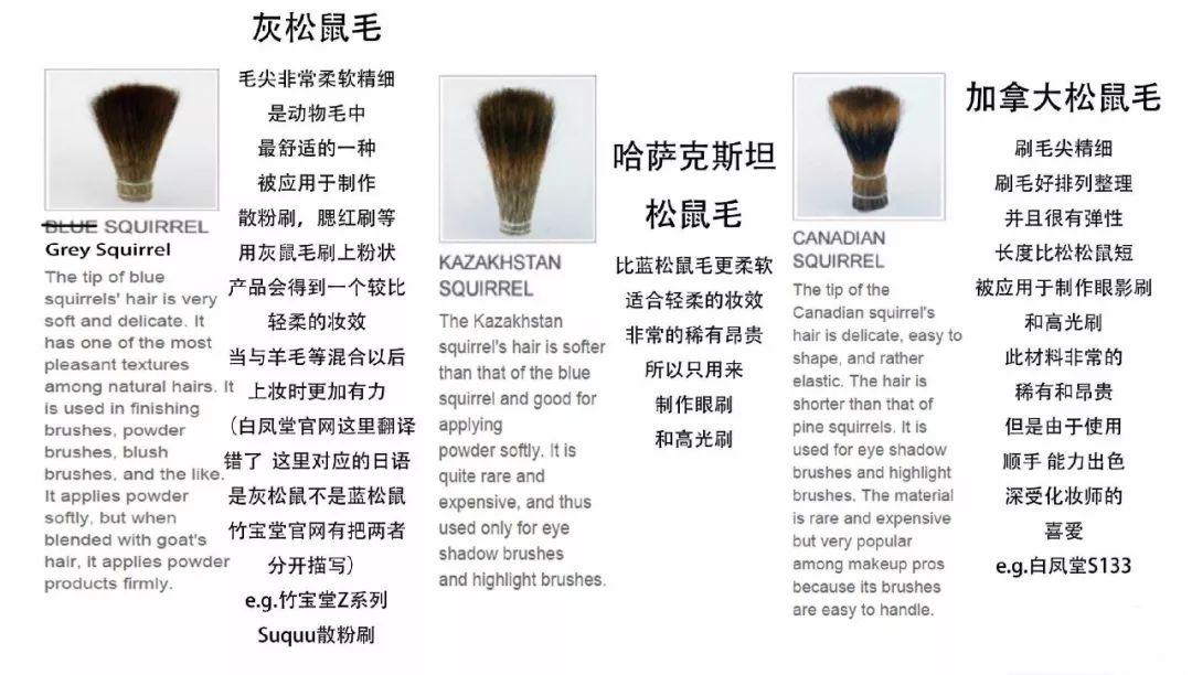 松鼠毛的种类特别多,世界各地的松鼠种类多嘛。常见的用来制作化妆刷的松鼠毛毛料有:红松鼠、灰松鼠、蓝松鼠、红灰松鼠、松松鼠、花松鼠、加拿大松鼠、白加拿大松鼠等等。