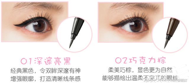 Canmake很实在,几乎每款眼线笔都有防水防汗防油的功能,毕竟做美妆的,深知眼睛晕妆是大家的痛。这款0.1毫米宽的眼线液笔,同样有防脱妆、快干、温水可卸的作用,和1.65那支一样,有棕色和黑色。