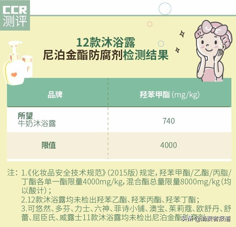 检测结果显示,12款沐浴露中,仅一款所望牛奶沐浴露含有羟苯甲酯740 mg/kg,含量符合我国标准要求。