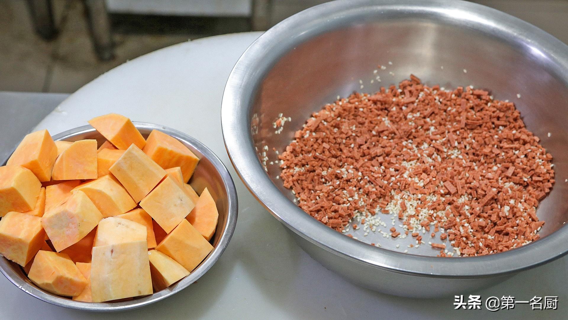 1.准备削皮的红薯一个,切成小方丁,放入小盆里面,超市里面买的山楂片两包,切成碎粒,放入盆中,再抓入一小把熟芝麻拌匀。