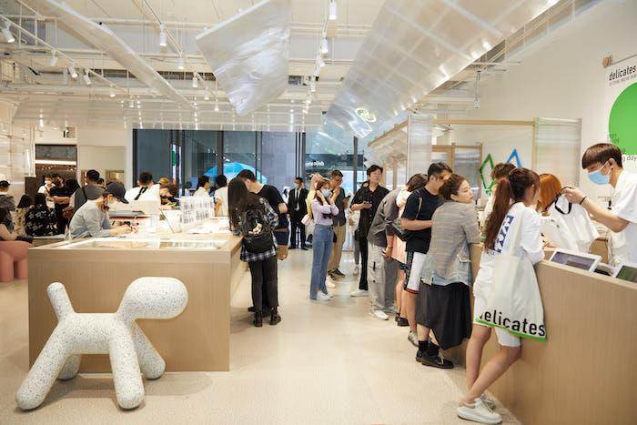 深度体验场的这家店我们逛完了,临走时看见店内络绎不绝的年轻人正在挑选并创作着属于自己的白T,突然意识到这些看似普通的白T实际上足以承载一段难忘的故事、一种性格的表达、一个对美和对可持续的需求。在设计形成与美、与可持续的互动,或许是delicates想表达的。