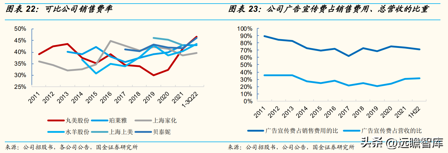 营销方面,公司早期主要通过电视台、时尚杂志、互联网投放广告。2007年丸美品牌聘请首位代言人——港姐、金像影后袁咏仪,随后开始冠名湖南卫视、江苏卫视等一线卫视众多综艺节目如《非诚勿扰》、《舞林大会》和《我们约会吧》等,并登上《ELLE》、《瑞丽》等头部时尚杂志。