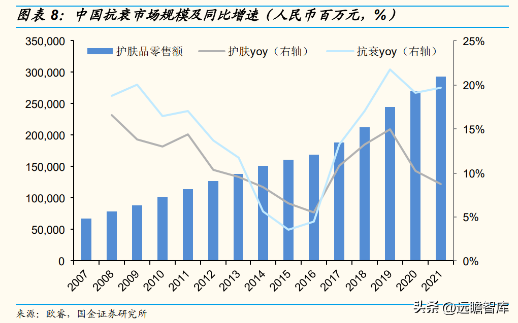 公司在行业红利大背景下通过高举高打差异化专注眼部抗衰护理。抗衰为护肤中高成长性赛道,根据欧睿,2007-2018年抗衰赛道终端零售规模增速高于护肤总体,CAGR为13%,同期护肤CAGR11为11%。